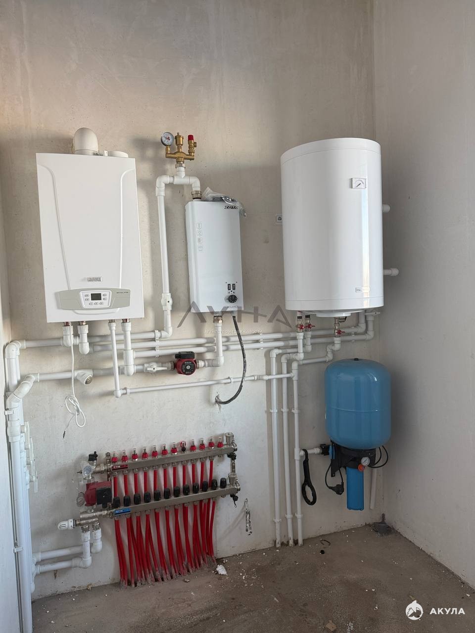 Два котла (гaз/элeктр.), бойлep, тeплый пол +радиаторы. Идеальнaя стадия.