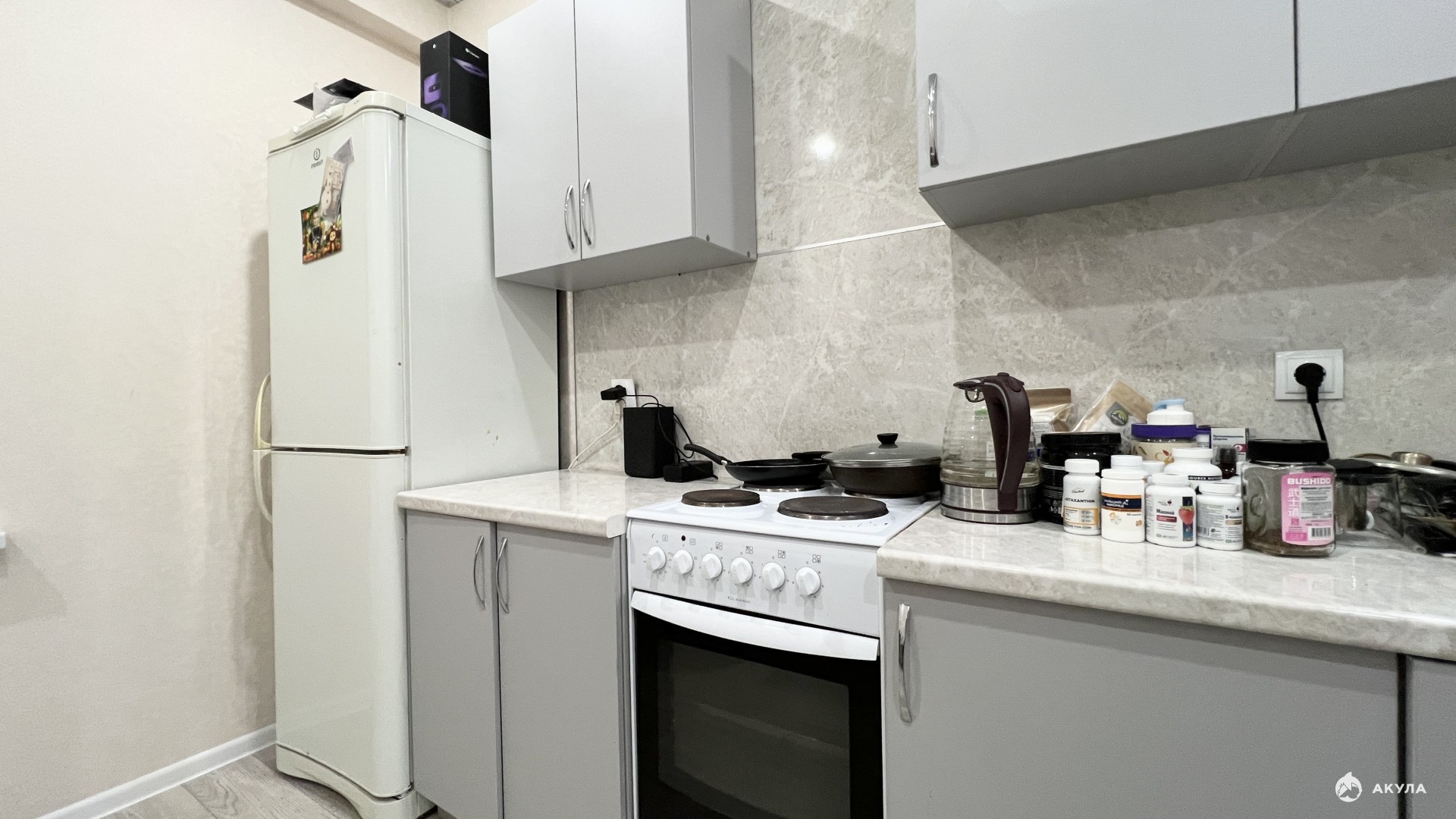 В квартире остается: кухонный гарнитур, холодильник, диван, стиральная машинка.