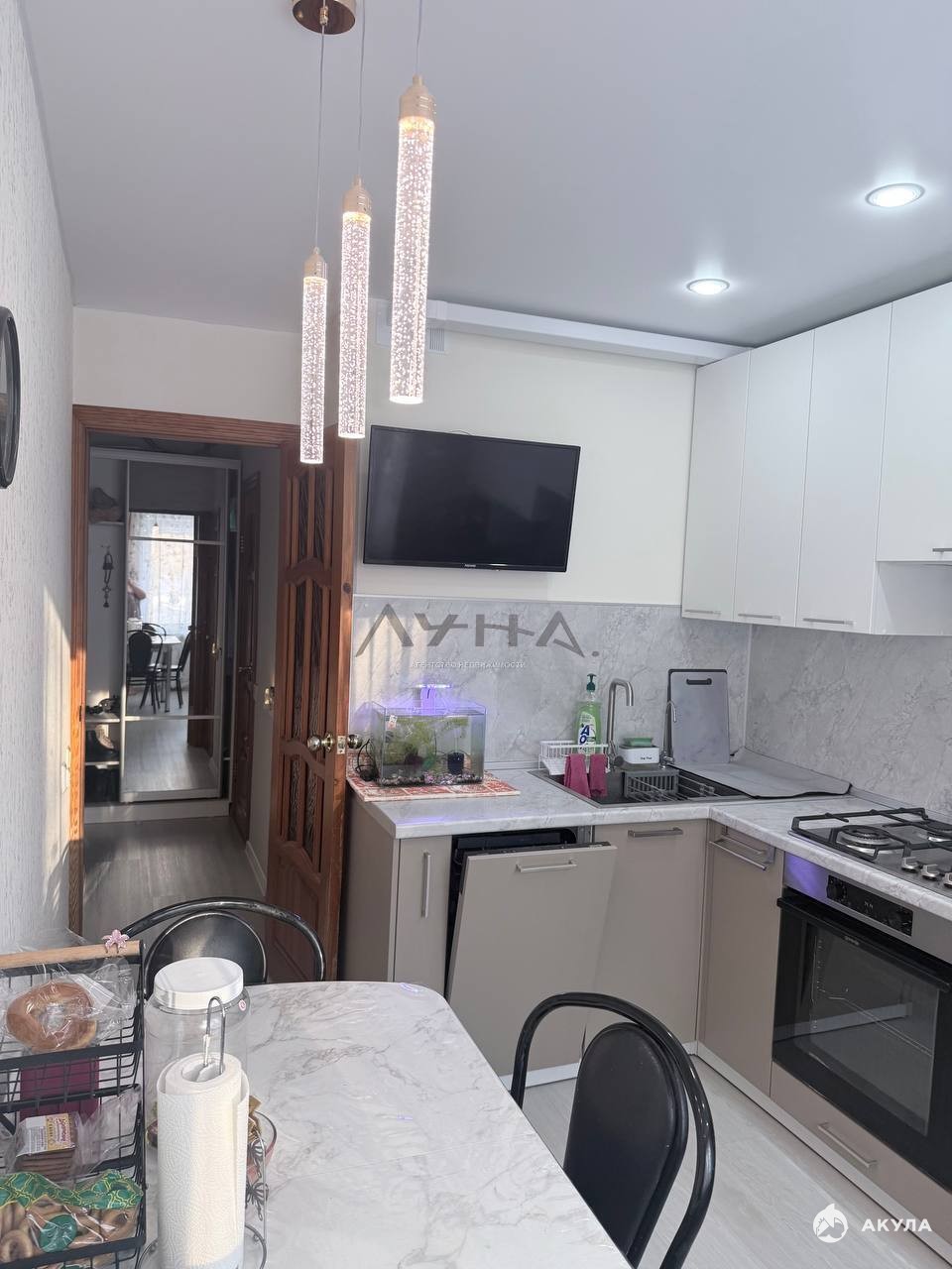 стильный натяжной потолок, новый кухонный гарнитур..