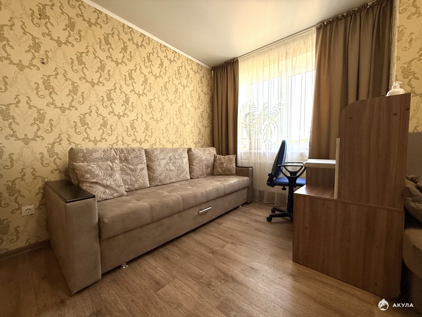 Просторный зал 18 м2 -можно зонировать под рабочую зону так как в комнате два окна