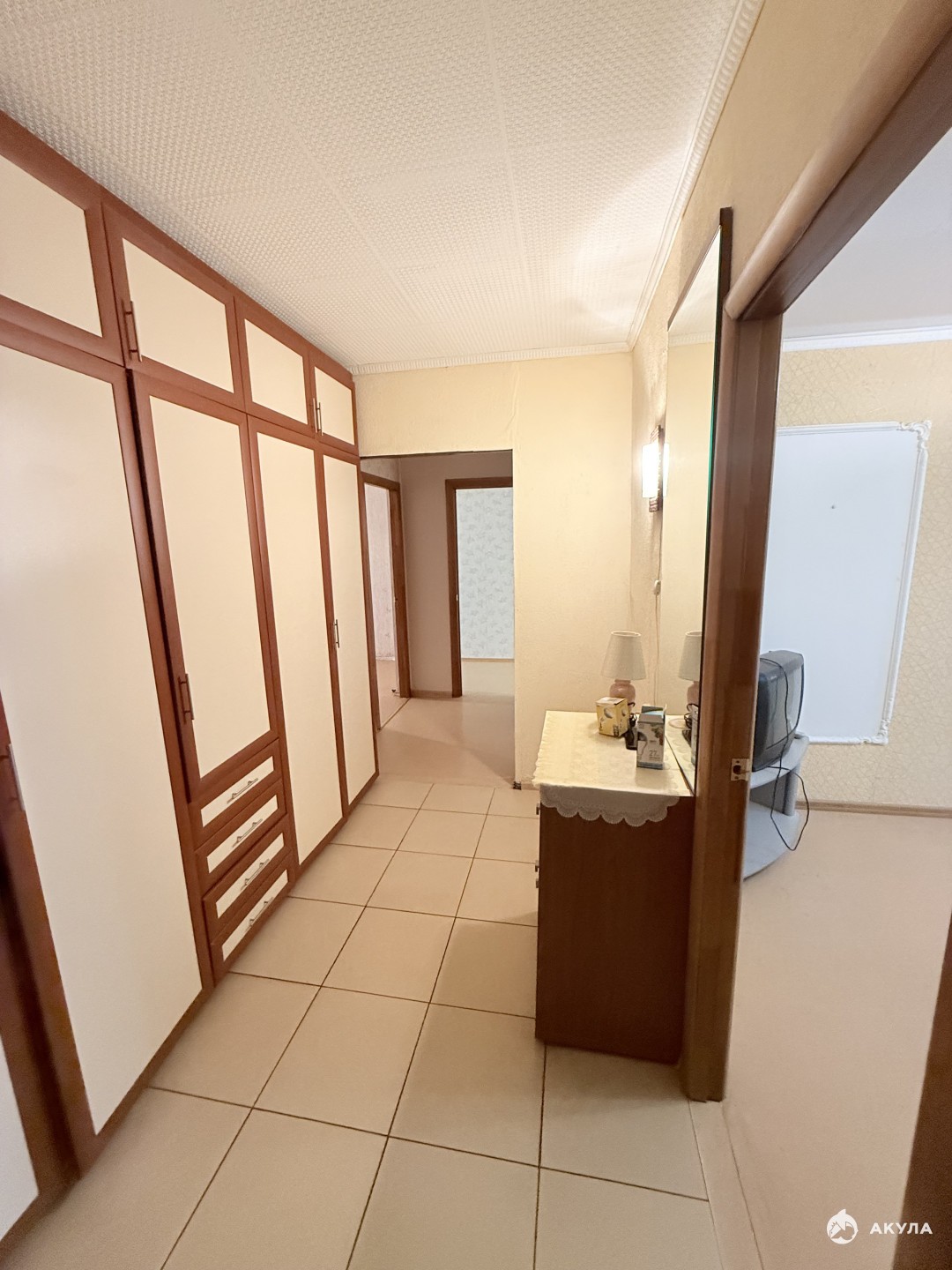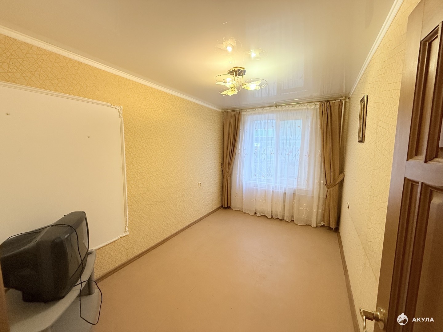 На стенах - обои, полы линолеум в комнатах, в коридоре и на кухне плитка на полу. Натяжные потолки, стеклопакеты- пластик, межкомнатные филенчатые двери.