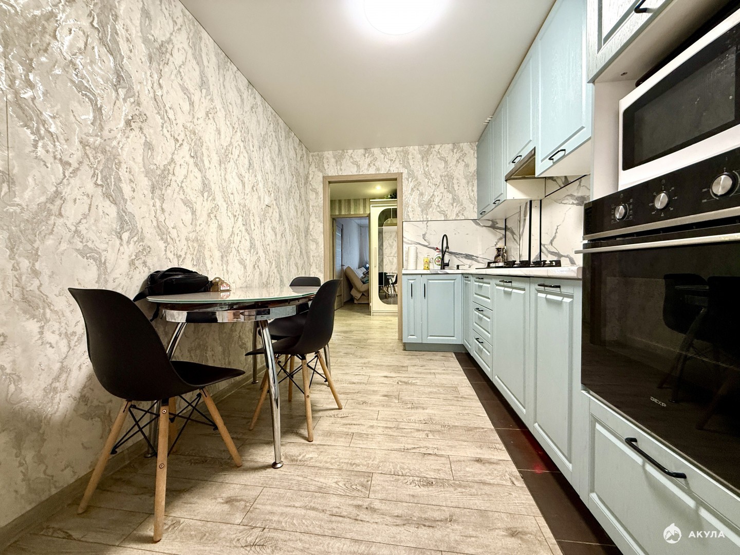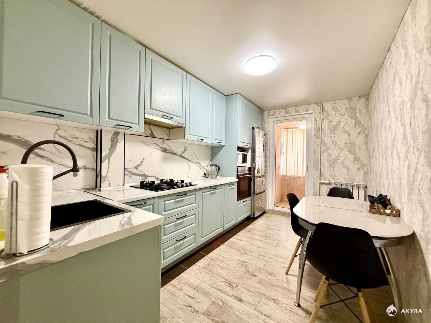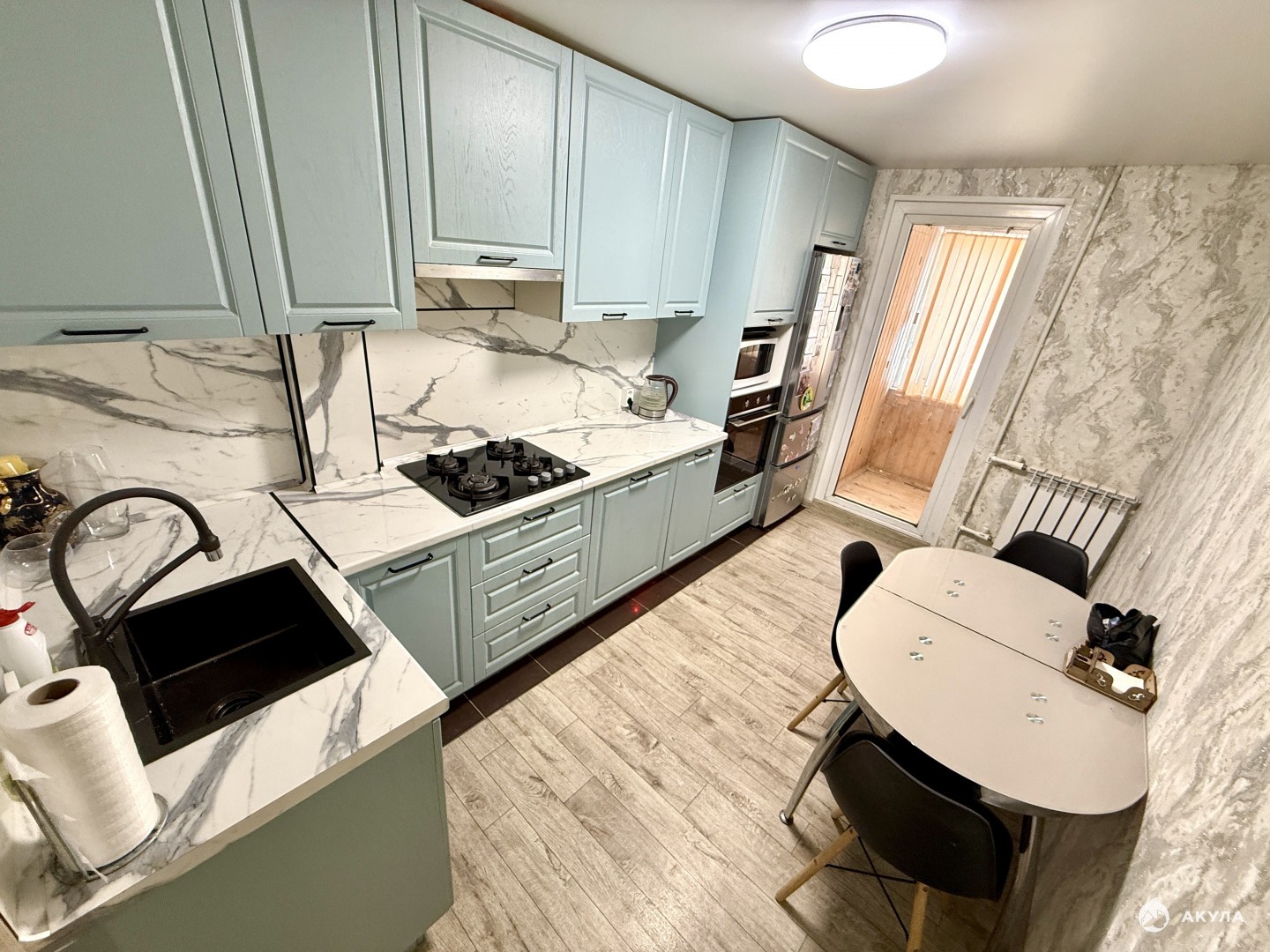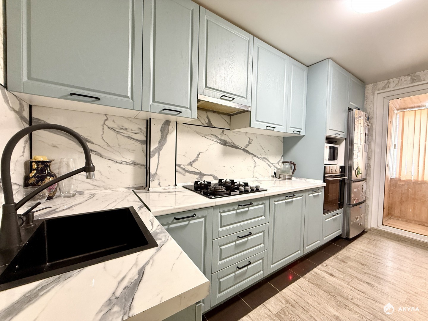Кухня увеличена, в хорошем состоянии кухонный гарнитур остается варочная панель