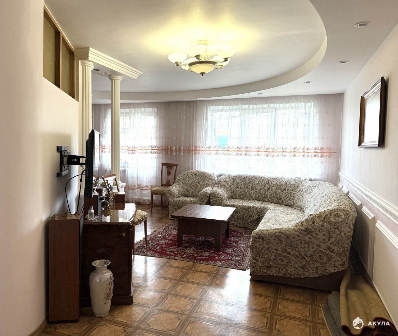 Пластиковые окна, красивые потолки с подсветкой/ гипсокартон, натяжные, полы- линолеум, плитка.